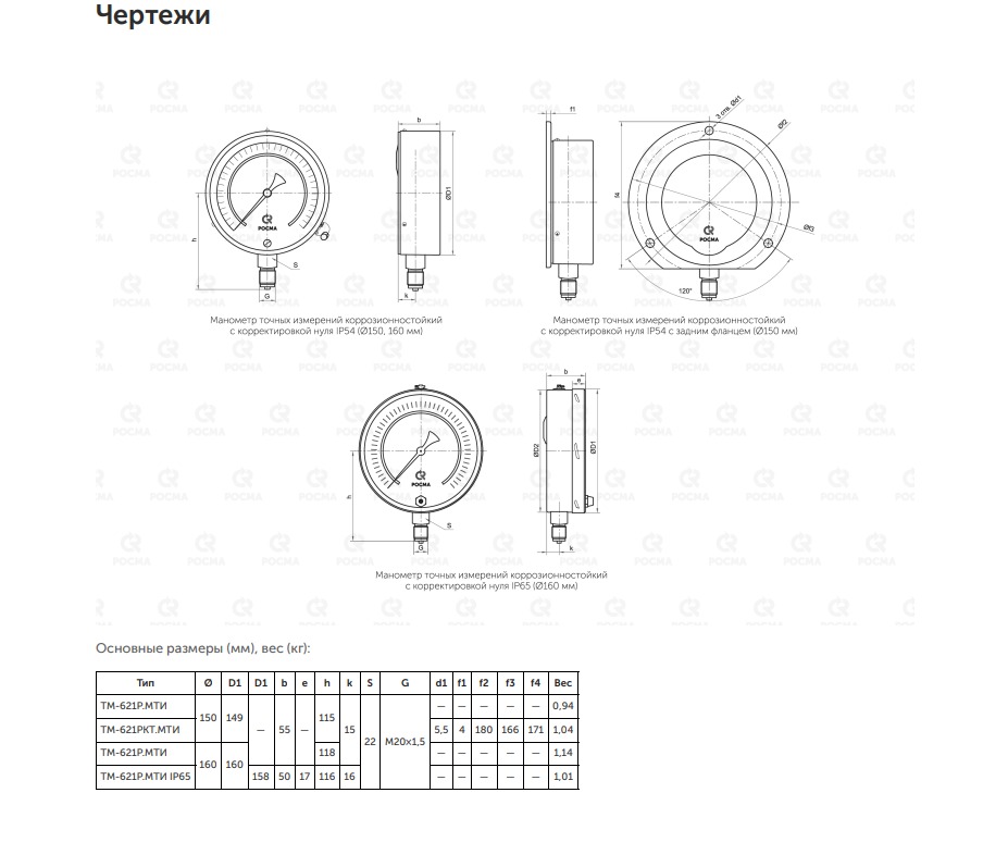| 150 / 160 | 0,4 | IP54 | 0…0,1 / 0,16 / 0,25 / 0,4 / 0,6 / 1 / 1,6 / 2,5 / 4 / 6 / 10 | M20×1,5 | радиальное | 11 850 |